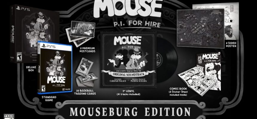 MOUSE: PI For Hire está previsto para ser lançado em 16 de abril e, caso ainda houvesse alguma dúvida, a Fumi Games e a PlaySide Publishing revelaram suas diferentes edições. Quem optar pela versão digital poderá adquirir a Edição Padrão por US$ 29,99, enquanto a Edição Digital Deluxe custará US$ 39,99. Esta última inclui a trilha sonora completa, além de uma nova faixa da banda Caravan Palace, uma história em quadrinhos digital e a primeira expansão, que será lançada em uma data posterior.