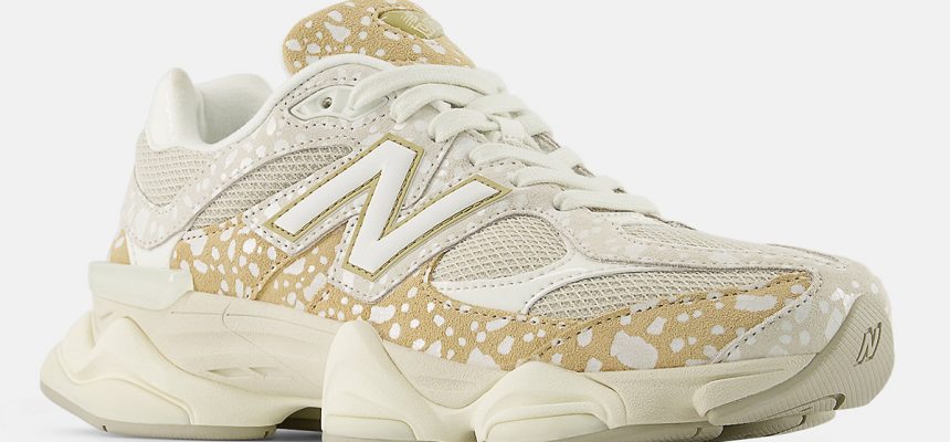 Dando continuidade a essa proposta abrangente, o New Balance 9060 agora entra no gênero “animal print”, algo que seu irmão, o New Balance 204L, experimentou recentemente e que quase todas as grandes marcas de artigos esportivos já exploraram de alguma forma. Assim como seu parceiro de sola fina, o 9060 veste esse visual de forma criativa, misturando duas aplicações diferentes da estampa de bolinhas: um tom de bege mais escuro no para-lama e na língua, antes de um bege bem mais discreto tomar conta das sobreposições intermediárias.